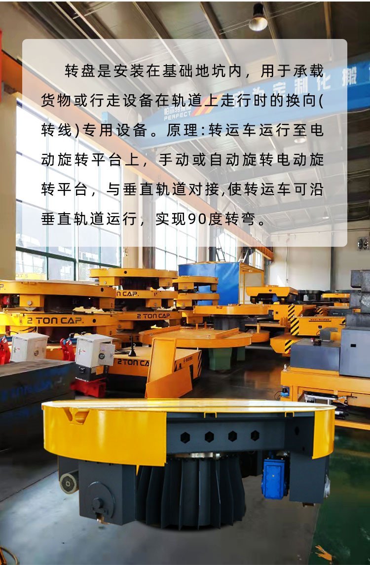 軌道轉盤車是車間鐵軌轉彎或者換軌道旋轉臺及用于對接換軌道的圓形電動轉盤,可實現360度任何一個角度停止,也可以實現也可實現井型十字交叉運行